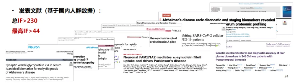同時,宇測生物樹立國內(nèi)AD血液生物標(biāo)志物學(xué)術(shù)影響旗幟,不斷推進(jìn)以神經(jīng)科學(xué)為核心的新型生物標(biāo)志物的臨床轉(zhuǎn)化與市場推廣,與國內(nèi)多家頭部醫(yī)院形成深度合作,發(fā)表多篇高影響力學(xué)術(shù)論文。目前在高端科研和頭部臨床單位已完成兩萬多例血液樣本研究,參與多項國內(nèi)大型隊列研究,平臺累計發(fā)表IF>230,為神經(jīng)科學(xué)超敏血液生物標(biāo)志物的疾病的研究提供最強(qiáng)助力。